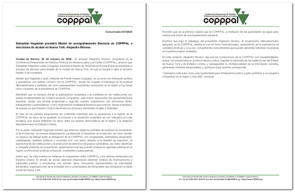 The first members of the COPPPAL Electoral Observatory, part of the Permanent Conference of Political Parties of Latin America and the Caribbean, have begun arriving in New York City to observe the municipal elections. The delegation has already started visiting several early voting sites.